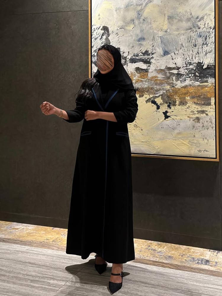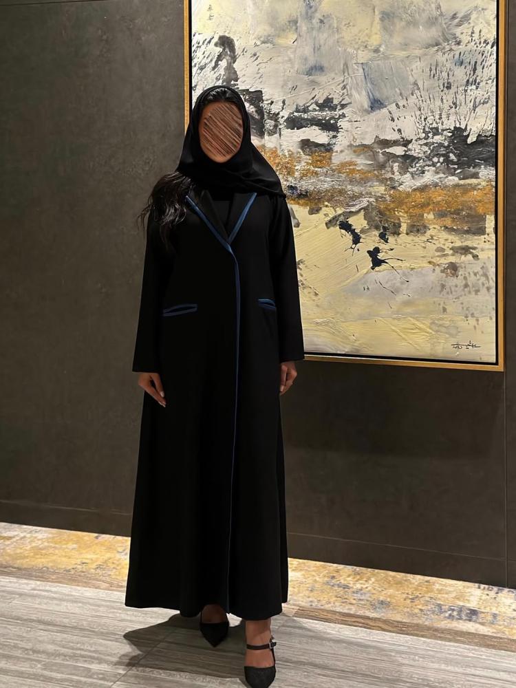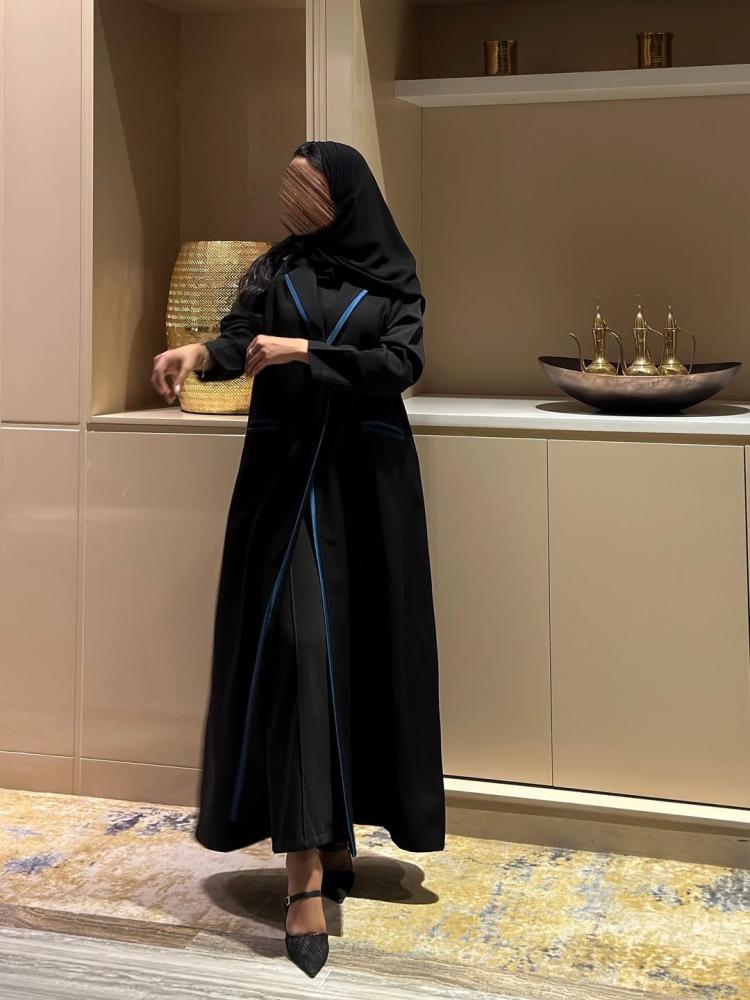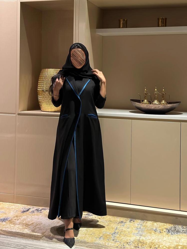 عباية بليزر مبطن كتان اسود مع قيطان تركواز